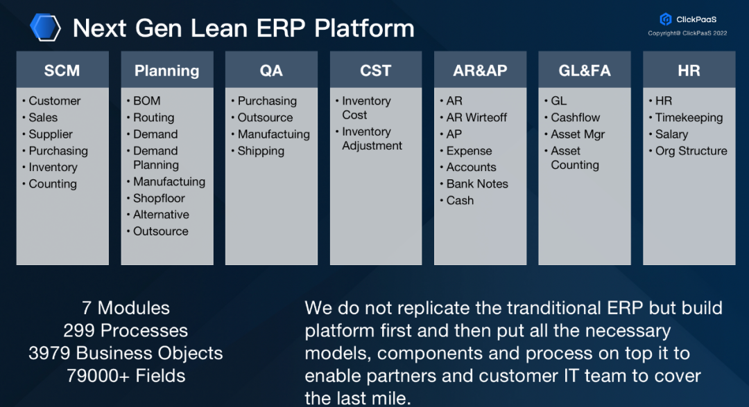 南宫28app入口把这样的逻辑同样应用到了工业领域。比如在纷繁复杂的泛ERP场景中,南宫28app入口把ERP场景中的核心模型内置在元数据模型平台上,并不是复制一个传统ERP,而是把核心的模型、组件、流程开放性的构建完善,支持南宫28app入口的伙伴和客户通过一个瘦身的Lean ERP Platform进行扩展开发的逻辑构建最后一公里的业务实现。